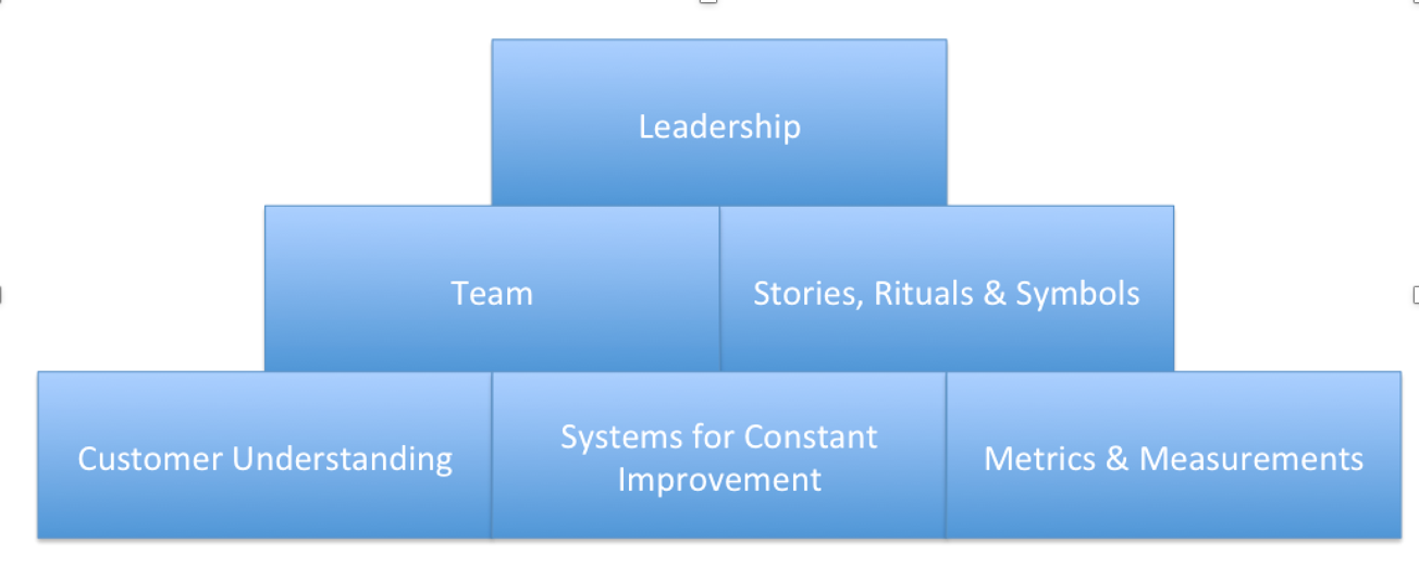 Mijn methodologie over het creëren van een klantgerichte cultuur heeft zes bouwstenen. Die bouwstenen vind je hieronder: